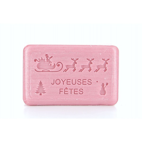 Savonnette de Noël estampillée Joyeuses Fêtes avec un jolie décor de Noël composé d'un sapin, d'un bonhomme de neige et du Père Noël sur son traineau avec ces rennes. Rouge, délicatement parfumé, il dégage une bonne odeur gourmande qui fait penser au sucre d'orge.